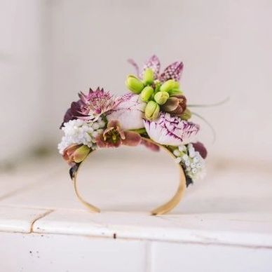A modern statement piece, designed on a structured cuff for a bold yet elegant look. Featuring fresh, seasonal blooms arranged with a natural, effortless style.